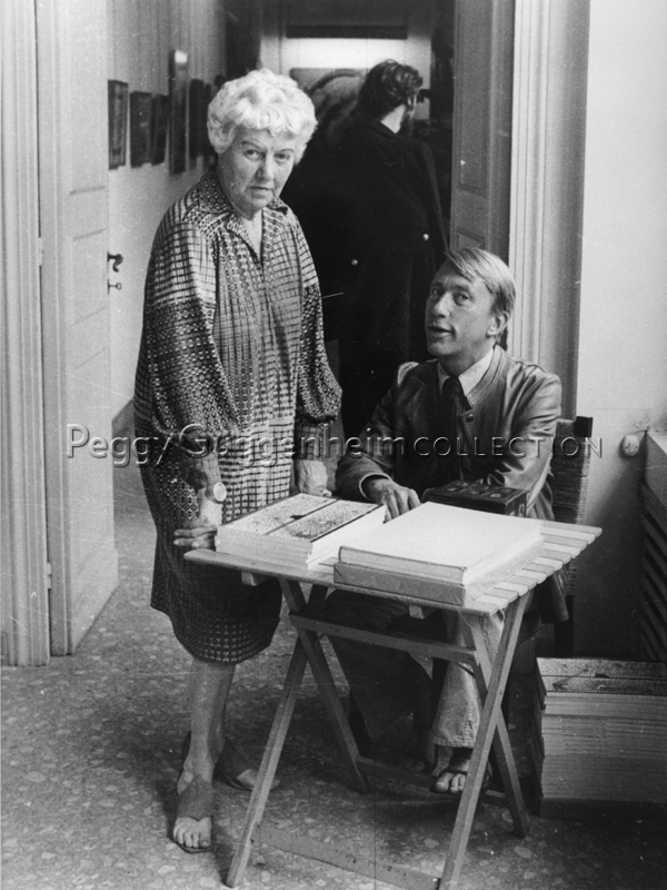Peggy Guggenheim accanto a John Hohnsbeen (studioso, storico dell'arte, segretario di Peggy negli anni '70) seduto al tavolo dei cataloghi durante un'esposizione a Palazzo Venier dei Leoni, fine anni '70.