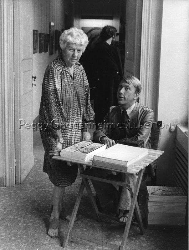 Peggy Guggenheim accanto a John Hohnsbeen (studioso, storico dell'arte, segretario di Peggy negli anni '70) seduto al tavolo dei cataloghi durante un'esposizione a Palazzo Venier dei Leoni, fine anni '70.