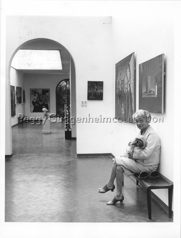 L'immagine ritrae Peggy Guggenheim seduta nella barchessa di Palazzo Venier dei leoni con in braccio uno dei suoi cani di razza Lhasa Apsos Terrier. Le tre tele che si vedono lungo la parete a destra della foto sono rispettivamente (da sinistra): "La pastorella delle sfingi" di Leonor Fini (1941, Peggy Guggenheim Collection), "L'aurora" di Paul Delvaux (luglio 1937, Peggy Guggenheim Collection) e "La torre rossa" di Giorgio de Chirico (1913, Peggy Guggenheim Collection). Alla parete di sinistra si susseguono i seguenti dipinti: Max Ernst "La foresta" (1927-28, Peggy Guggenheim Collection), Max Ernst "L'antipapa" (dicembre 1941-marzo 1942, Peggy Guggenheim Collection), due opere che non si identificano dall'immagine, Joan Mirò "Donna seduta II" (27 febbraio 1939, Peggy Guggenheim Collection), e le due sculture "Figura maschile in piedi" delle Sculture dall'Africa (Peggy Guggenheim Collection, PG 257) e "Figura sdraiata" (1938, Peggy Guggenheim Collection) di Henry Moore. Sui due piedistalli bianchi vediamo la scultura di Jean Arp "Corona di germogli I" (1936, Peggy Guggenheim Collection) e, dietro, "Donna sgozzata" (1932, Peggy Guggenheim Collection) di Alberto Giacometti. Addossata alla colonna invece è collocata la scultura "Intaglio funerario" della collezione delle Sculture dall'Oceania (232, Peggy Guggenheim Collection)