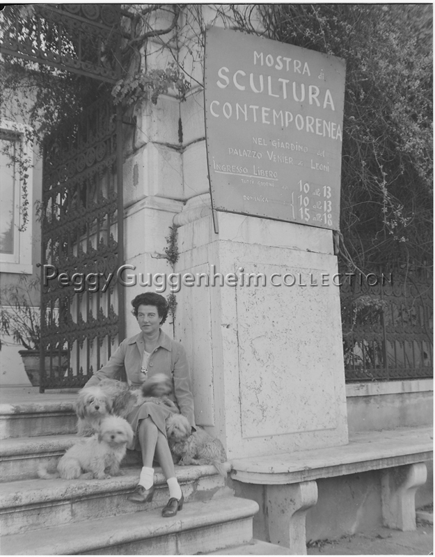 Peggy Guggenheim seduta tra alcuni dei suoi cani Lhasa Apsos Terrier, sugli scalini di terrazza Marini, a Palazzo Venier dei Leoni , in occasione della prima mostra da lei organizzata a Venezia: “Mostra di scultura contemporanea”, nel settembre 1949