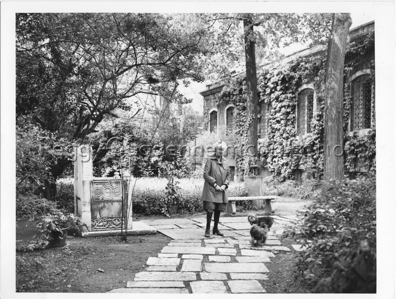 L'immagine ritrae Peggy Guggenheim nel giardino di Palazzo Venier dei Leoni negli anni '70. Si vedono alla sinistra dell'immagine il "trono bizantino", che ornava il giardino già da prima dell'acquisto della struttura da parte di Peggy, e l'opera "Segnale" (1958, Peggy Guggenheim Collection) di Takis. Accanto a Peggy si vedono due dei suoi cani Lhasa Apsos Terrier. Dietro la panchina che orna il giardino è collocata, sopra un piedistallo, la scultura di Fritz Koenig "Biga" (1957, Peggy Guggenheim Collection).