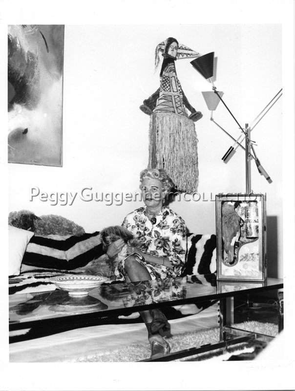 L'immagine ritrae Peggy Guggenheim a Palazzo Venier dei Leoni seduta su un divano mentre abbraccia uno dei suoi Lhasa Apsos Terrier. Sul tavolo della stanza è collocata l'opera di Joseph Cornell "Pappagallo che predice il futuro" (1937-38 ca., Peggy Guggenheim Collection). Alla parete invece si vede in parte la tela di Edmondo Bacci "Avvenimento #247" (1956, Peggy Guggenheim Collection), accanto alla quale è posizionata "Maschera da corteccia" della collezione delle Sculture dalle Americhe (Peggy Guggenheim Collection, PG261).
