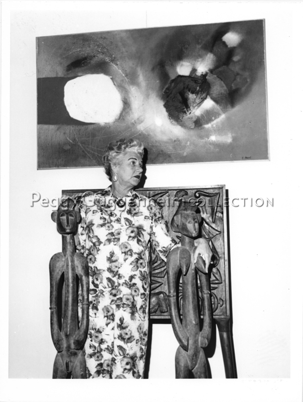 L'immagine ritrae Peggy Guggenheim a Palazzo Venier dei Leoni. Peggy è ripresa davanti al mobile bar che arredava la sua casa e abbraccia una coppia di sculture machili e femminili in legno provenienti dall'Africa e che erano due strumenti musicali, utilizzati per battere il ritmo (Peggy Guggenheim Collection, 250a-b). Appesa alla parete c'è la tela di Edmondo Bacci "Avvenimeto #292" (1956, Peggy Guggenheim Collection).