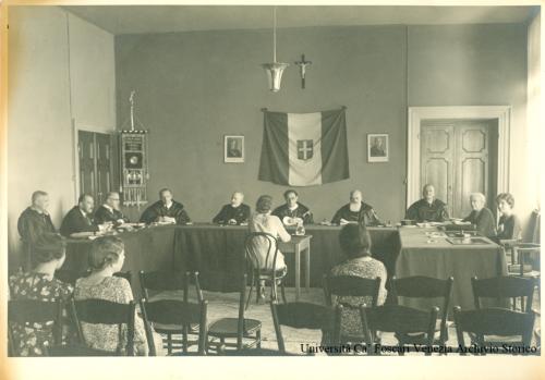 Venezia, Ca' Foscari: Istituto Universitario di Economia e Commercio (IUEC, oggi Università Ca' Foscari Venezia). Commissione di laurea formata da dieci docenti, tra i quali, al centro, il rettore Agostino Lanzillo esamina una giovane. Tre donne di spalle sedute nella platea.