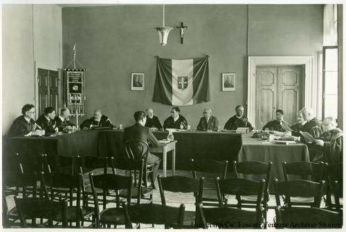 Venezia, Ca' Foscari: Istituto Universitario di Economia e Commercio (IUEC, oggi Università Ca' Foscari Venezia). Commissione di laurea formata da dodici docenti, tra i quali, al centro, il rettore Agostino Lanzillo, esamina un giovane.