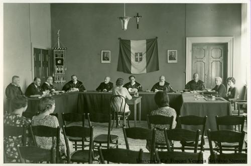 Venezia, Ca' Foscari: Istituto Universitario di Economia e Commercio (IUEC, oggi Università Ca' Foscari Venezia). Commissione di laurea formata da dieci docenti, tra i quali, al centro, il rettore Agostino Lanzillo esamina una giovane. Tre donne di spalle sedute nella platea.