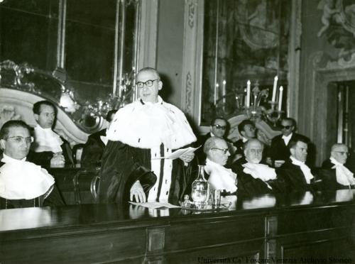 Venezia. Ca' Dolfin, Aula Magna: il rettore Italo Siciliano, in piedi, alla cattedra, legge rivolto al pubblico, circondato da docenti seduti e distribuiti su due file.