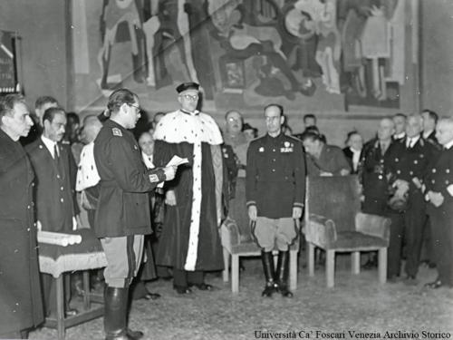 Venezia. Ca' Foscari: un ufficiale legge alla presenza del rettore Gino Zappa e degli altri partecipanti alla cerimonia inaugurale dell'Anno Accademico.