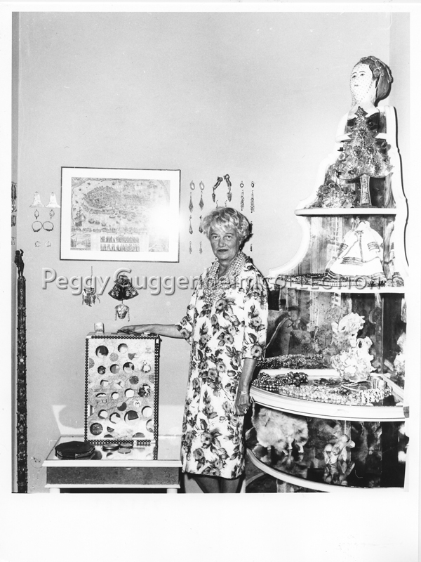 L'immagine ritrae Peggy Guggenheim nella sua camera da letto a Palazzo Venier dei Leoni accanto all'opera di Joseph Cornell " "Shoot-the-Chutes" svizzero" (1941, Peggy guggenheim Collection). Alle pareti è appesa un'antica stampa di Venezia, attorno alla quale si dispiega la collezione personale di orecchini raccolti dalla collezionista durante i suoi viaggi in tutto il mondo. All'angolo della stanza è collocato un mobile porta oggetti sulla cima del quale si può notare un antico manichino porta gioielli, mnetre più in basso, sul terzo scaffale, è posta una scultura del pimo marito di Peggy, Laurence Vail.