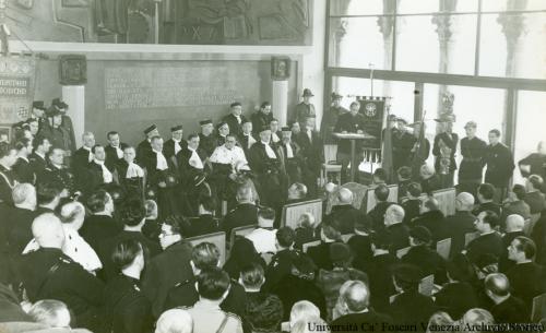 Venezia, Ca' Foscari: Aula Magna o Aula degli Atti Accademici poi Aula Baratto. Cerimonia di inaugurazione dei locali di Ca' Foscari, restaurati. Seduto al centro il rettore Agostino Lanzillo, alla cui destra siede il prof. Carlo Alberto Dell'Agnola, a sinistra il prof. Gino Zappa.