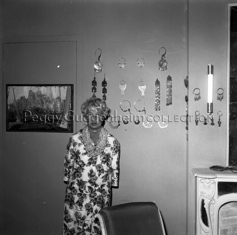 L'imagine ritrae Peggy Guggenheim nella sua stanza da letto a Palazzo Venier dei Leoni davanti alla sua collezione di orecchini provenienti da tutto il mondo. Alla sua destra è collocata l'opera di William Congdon "Cambogia" (1960, Peggy Guggenheim Collection).