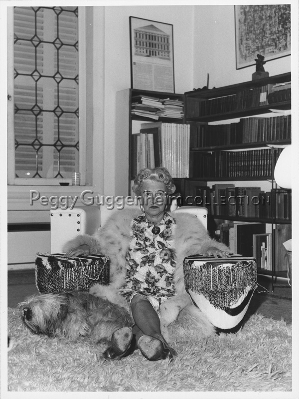 Servizio fotografico: Peggy Guggenheim con vestito bianco a motivo floreale e pelliccia a Palazzo Venier