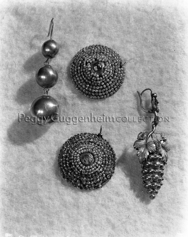 Orecchini personali di Peggy Guggenheim: da sinistra: un orecchino moderno spagnolo formato da tre piccole sfere, due orecchini provenienti dagli scavi di Creta costituiti da file circolari di perline, un orecchino francese dell'epoca di Luigi Filippo a forma di grappolo d'uva.