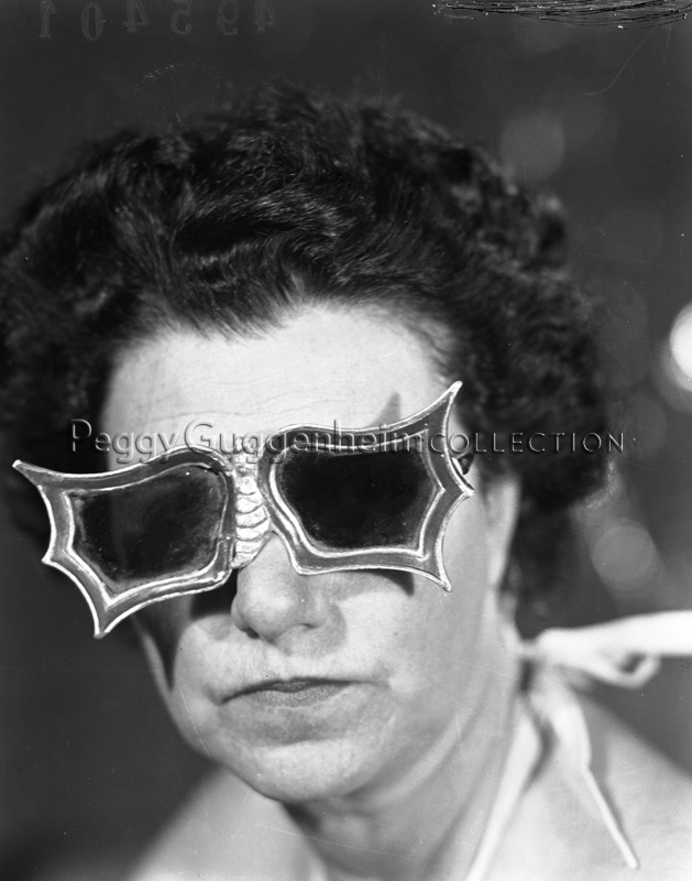 Ritratto di Peggy Guggenheim con gli occhiali a forma di farfalla creati per lei dall'artista americano Edward Melcarth.