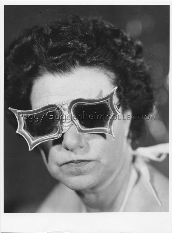 Ritratto di Peggy Guggenheim con gli occhiali a forma di farfalla creati per lei dall'artista americano Edward Melcarth.