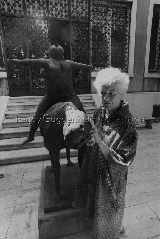 Peggy Guggenheim nella terrazza di Palazzo Venier dei Leoni, accanto alla scultura di Marino Marini, "Angelo della città" (1948).
