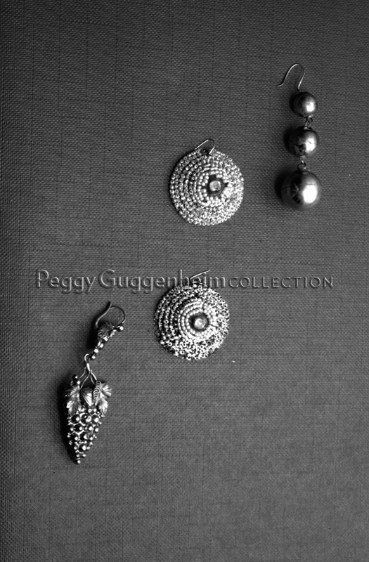 Orecchini personali di Peggy Guggenheim: da destra: un orecchino moderno spagnolo formato da tre piccole sfere, due orecchini provenienti dagli scavi di Creta costituiti da file circolari di perline, un orecchino francese dell'epoca di Luigi Filippo a forma di grappolo d'uva.
