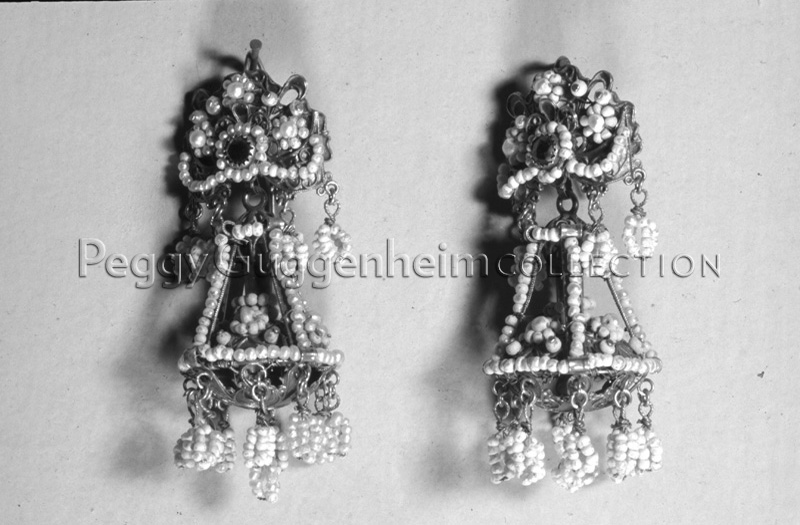 Due orecchini veneziani del settecento della collezione di Peggy Guggenheim a forma di pendente con pietre e perle incastonate.
