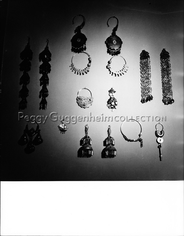 Orecchini della collezione Peggy Guggenheim appesi in una parete della stanza da letto a Palazzo Venier dei Leoni.