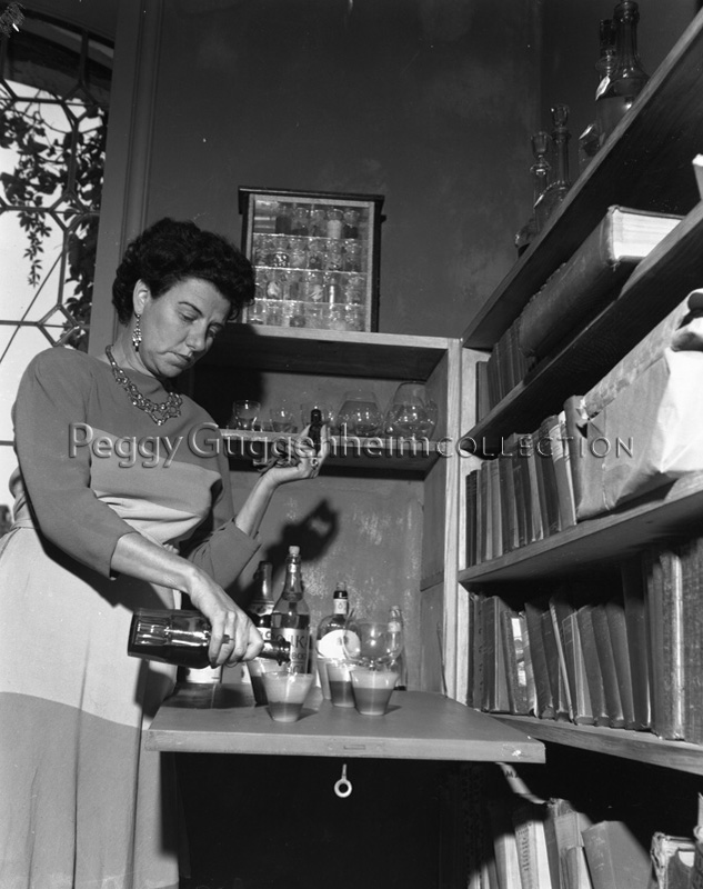Peggy Guggenheim è ritratta in questa immagine in una delle sale di Palazzo Venier dei Leoni mentre versa del liquore in un bicchiere. Sopra la mensola si può vedere l'opera di Joseph Cornell "Untitle - Pharmacy" (ca. 1924, Peggy Guggenheim Collection).
