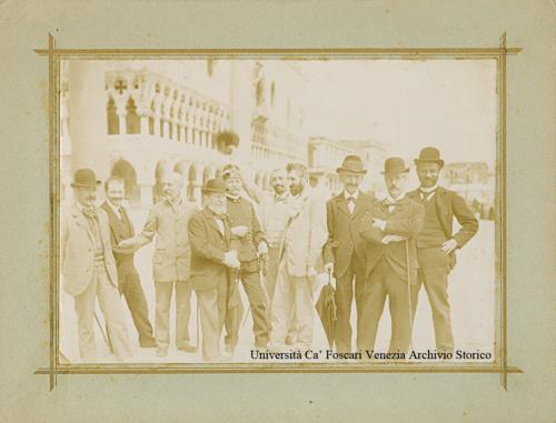 Ritratto di gruppo di dieci uomini, probabilmente si tratta di docenti della Regia Scuola Superiore di Commercio di Venezia (oggi Università Ca' Foscari Venezia), in Piazzetta San Marco a Venezia. Il quarto uomo, da sinistra, con bombetta e ombrello, potrebbe essere il prof. Enrico Castelnuovo. Sullo sfondo, a sinistra, si intravede la facciata di Palazzo Ducale.