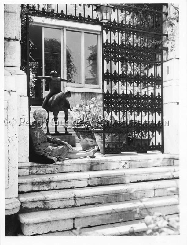La foto ritrae Peggy Guggenheim seduta sugli scalini della terrazza di Palazzo Venier dei Leoni che affaccia sul Canal Grande, denominata anche Terrazza Marini dall'opera che vi è collocata, ovvero "L'angelo della città" di Marino Marini (1948, Peggy Guggenheim Collection).