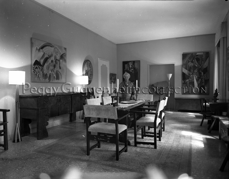 La sala da pranzo di Peggy Guggenheim negli anni '60. Nella nicchia della portamurata l'opera di Boccioni "Dinamismo di un cavallo in corsa + case (1914-15) acquistato da Peggy all'inizio del 1958. Le lampade ai lati del magnifico cassone rustico veneziano sono di Venini, il tavolo e le sedie sono nel tipico stile cinquecentesco dell'Italia settentrionale. Alle pareti alcuni dipinti della sua collezione.