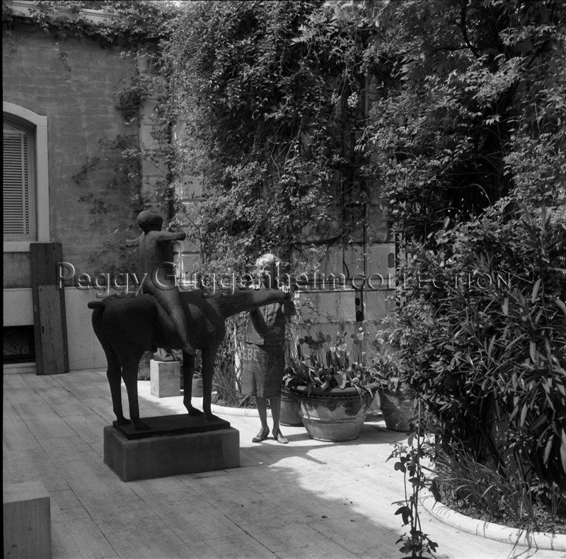 L'immagine ritrae Pegy Guggenheim sul Terrazzo di Palazzo Venier dei Leoni che affaccia direttamente sul Canal Grande con l'opera di Marino Marini "Langelo della città" (1948, Peggy Guggenheim Collection).
