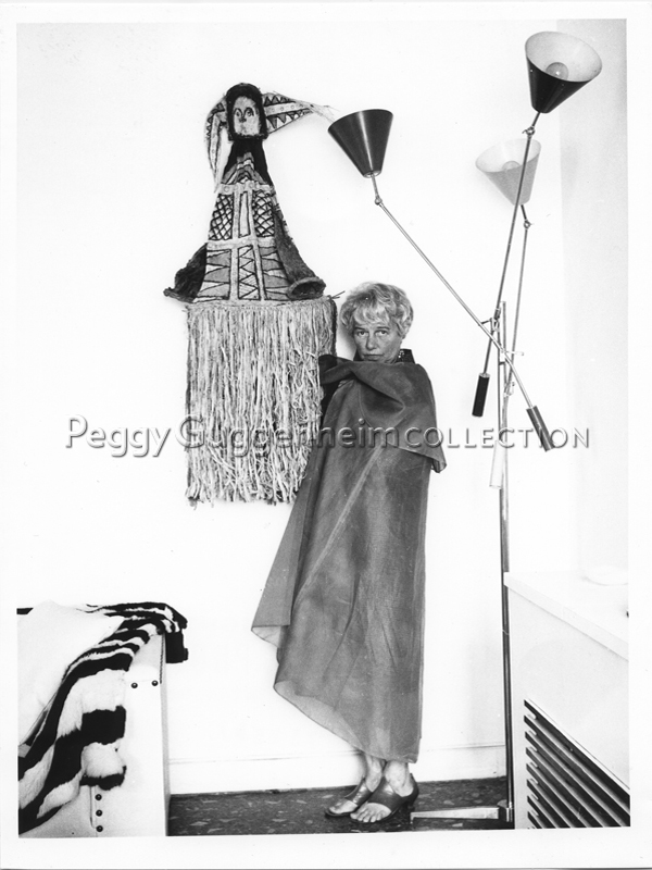 L'immagine ripende Peggy Guggenheim a Palazzo Venier dei Leoni vicino all'opera "Maschera da corteccia" della collezione delle Sculture dalle Americhe (Peggy Guggenheim Collection, PG261). Alla destra della foto si vede anche una lampada a tre bracci che decorava la casa di Peggy in quegli anni.