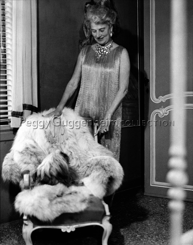 Peggy Guggenheim nella sua camera da letto accanto ad una poltrona, indossa un abito disegnato per lei da Mariano Fortuny; alle sue spalle il dipinto di Francis Bacon "Studio per scimpanzè", anni '60.