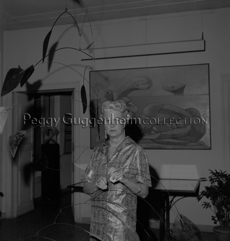 L'immagine ritrae Peggy Guggenheim all'entrata di Palazzo Venier dei Leoni con l'opera di Alexander Calder "Mobile" (1941, Peggy Guggenheim Collection). Alle sue spalle vediamo Pablo Picasso con "Sulla spiaggia" (1937, Peggy Guggenheim Collection). Dalla porta sulla sinistra della foto si intravedono la scultura di Antoine Pevsner "Superficie sviluppabile" (1938 - agosto 1939, Peggy Guggenheim Collection, PG61) e la tela di Piet Mondrian "Composizione" (1938-39, Peggy Guggenheim Collection).