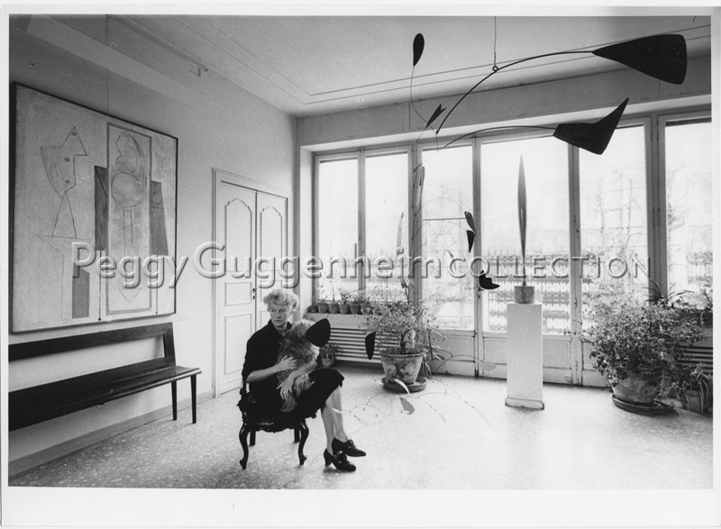 L'immagine ritrae Peggy Guggenheim seduta nel salone d'ingresso di Palazzo Venier dei Leoni con uno dei suoi amati cani di razza Lhasa Apsos Terrier in braccio. Alla parete di sinistra si può vedere l'opera di Pablo Picasso "L'atelier" (1928, Peggy Guggenheim Collection), appeso al soffitto invece "Arco di Petali" di Alexander Calder (1941, Peggy Guggenheim Collection). In fondo alla sala su un piedistallo si può ammirare invece "L'uccello nello spazio" (1932-40, Peggy Guggenheim Collection).