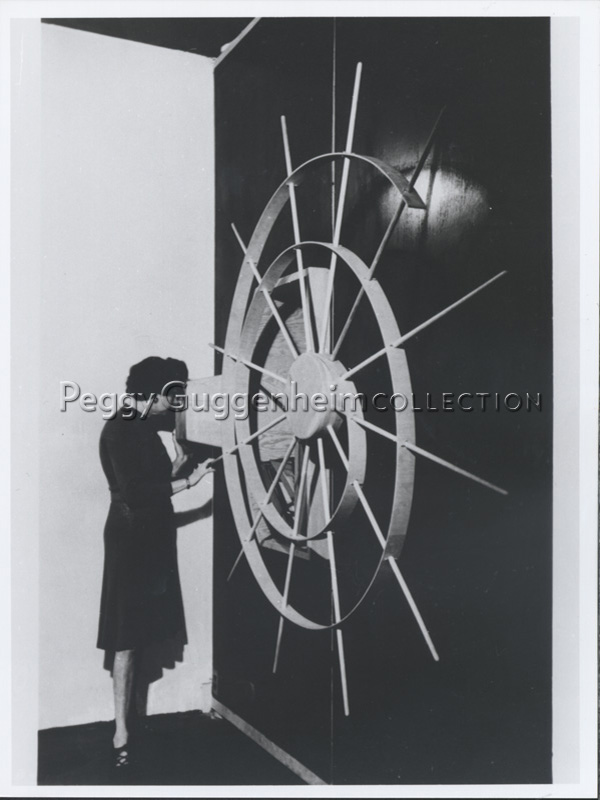 Peggy Guggenheim mentre guarda attraverso lo spioncino del "peep-show", progettato da Frederick Kiesler per osservare l'opera di Marcel Duchamp, "Scatola in una valigia (Boîte en-valise)" del 1941 (PG10), esposta nella galleria cinetica della galleria-mostra Art of This Century di Peggy Guggenheim a New York nel 1942. Allestimento di Frederick Kiesler.
