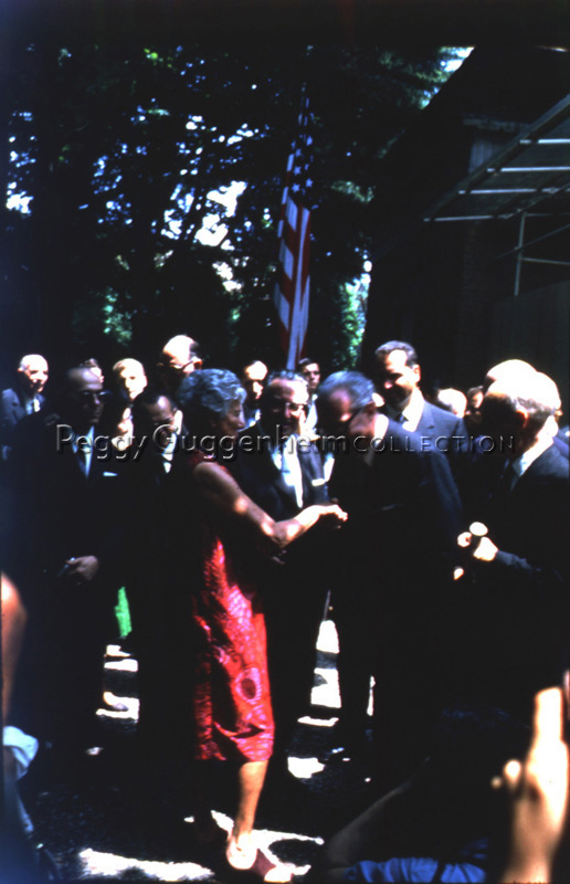 Servizio fotografico: Peggy Guggenheim con vestito rosso ad un evento
