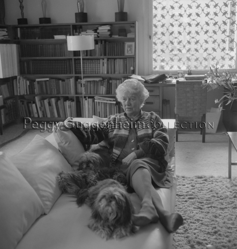 L'immagine ritrae Peggy Guggenheim, con una caviglia fasciata, seduta su uno dei divani della biblioteca di Palazzo Venier dei Leoni in compagnia di tre dei suoi Lhasa Apsos Terrier. Sopra la libreria angolare si vedono alcune sculture in vetro montate su piedistalli di materiale ligneo e metallico.