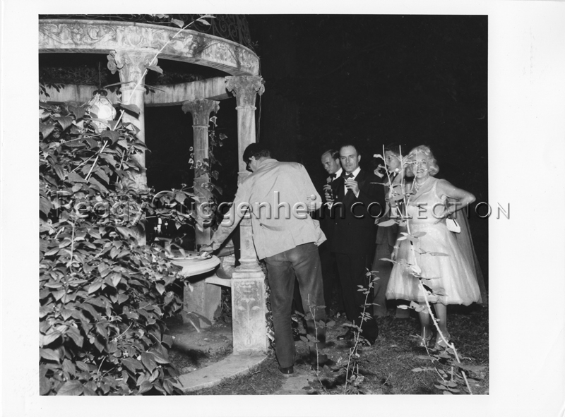 Festa in maschera nel giardino di Palazzo Venier dei Leoni negli anni cinquanta. Gli invitati, fra cui vediamo una delle sorelle Casellati, all'estrema destra della fotografia, si stanno servendo da bere dal gazebo in pietra del giardino.