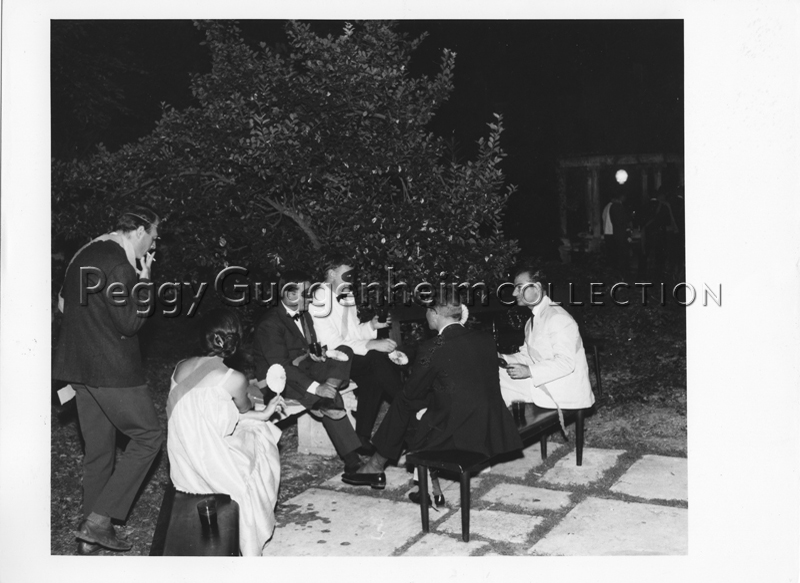 Festa a Palazzo Venier dei Leoni a Venezia negli anni cinquanta. Gruppo di ospiti di Peggy Guggenheim seduti nel giardino del palazzo.