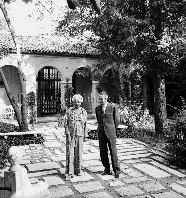 L'immagine ritrae Peggy Guggenheim in compagnia dell'artista George Giusti nel giardino di Palazzo Venier dei Leoni. In basso a sinistra della foto si vede in parte il trono bizantino che orna tuttora il giardino. Davanti all'ingresso del Palazzo è posta invece l'opera di Germaine Richier "Tauromachia" (1953, Peggy Guggenheim Collection).