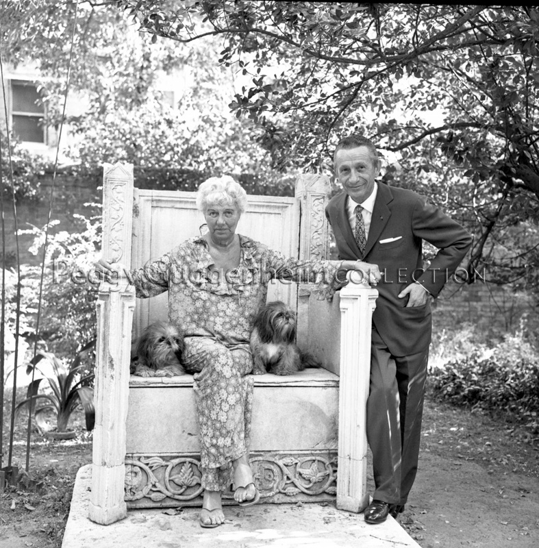 L'immagine ritrae Peggy Guggenheim con due dei suoi cani di razza Lhasa Apsos Terrier seduta sul trono bizantino nel giardino di Palazzo Venier dei Leoni con il pittore Giorgio Giusti accanto.