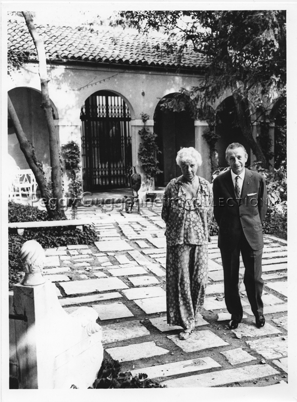 L'immagine ritrae Peggy Guggenheim in compagnia dell'artista George Giusti nel giardino di Palazzo Venier dei Leoni. In basso a sinistra della foto si vede in parte il trono bizantino che orna tuttora il giardino. Davanti all'ingresso del Palazzo è posta invece l'opera di Germaine Richier "Tauromachia" (1953, Peggy Guggenheim Collection).