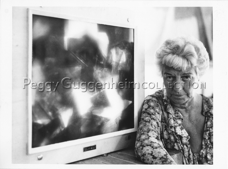 L'immagine è composta da un primo piano di Peggy Guggenheim ripresa vicino ad un'opera di George Giusti facente parte della serie "Giusti's Dreams".