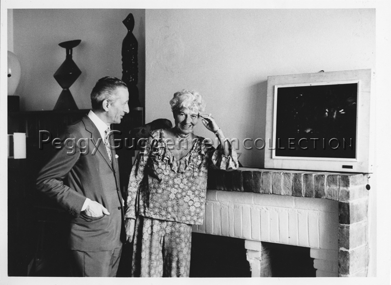 L'immagine ritrae Peggy Guggenheim in compagnia dell'artista George Giusti a Palazzo Venier dei Leoni. Sul caminetto della stanza è collocata l'opera "Incubo in verde n.2" (datazione e destinazione ignote). In alto a sinistra si vedono un'opera un vaso di forme geometriche e una scultura.