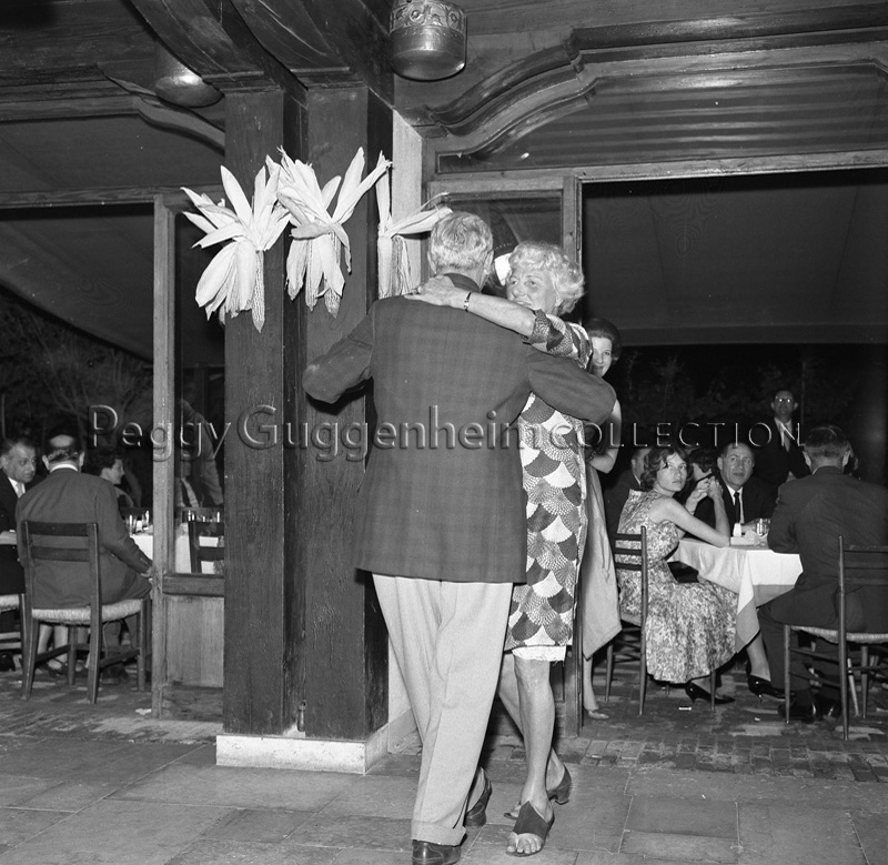 Peggy Guggenheim ad una cena alla fine degli anni sessanta in un locale veneziano, mentre balla assieme ad un uomo.