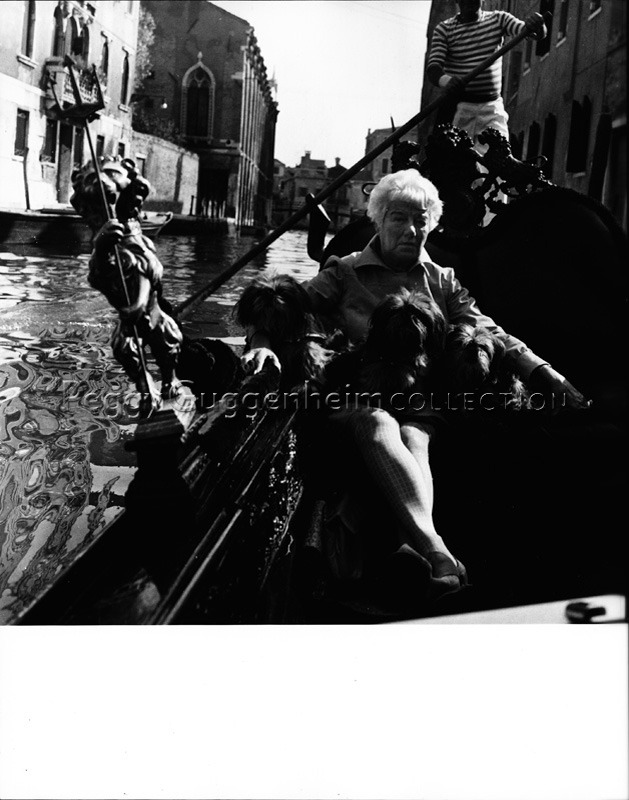 Peggy Guggenheim sulla sua gondola, in compagnia di alcuni dei suoi cani, lungo il canale della Misericordia, fine anni '60.