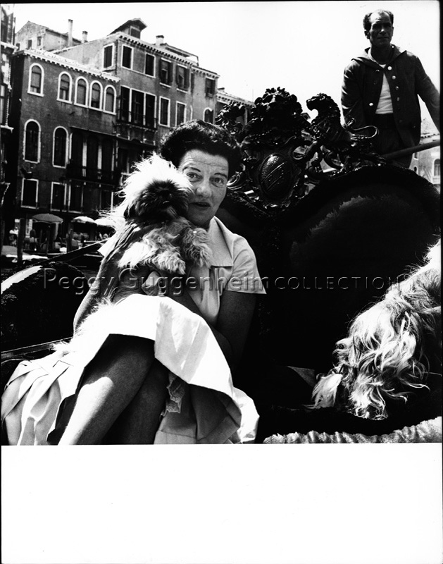 Peggy Guggenheim sulla sua gondola, con uno dei suoi cani Lhasa Apsos in braccio, primi anni '50.