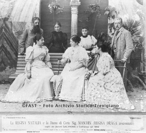 Ritratto di gruppo in un esterno a Villa Galvagna. Nell'ordine, da sinistra a destra, in primo piano, compaiono (cfr. etichetta): Regina Natalia, Baronessa Tattiana Galvagna, Nob. Mannati nipote Galvagna. In secondo piano: Bar. Francesco Galvagna, Persico moglie al Bar. G. Galvagna, Sig Maschin (Regina Draga assassinata), Bar. GIU. Galvagna.