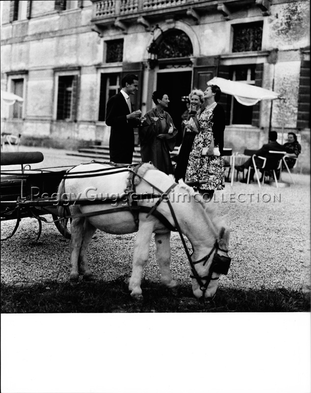 Peggy Guggenheim ospite di alcuni amici a Villa Condulmer, a Zerman di Mogliano Veneto. In primo piano un calessino trainato da un pony bianco. Anni '50.