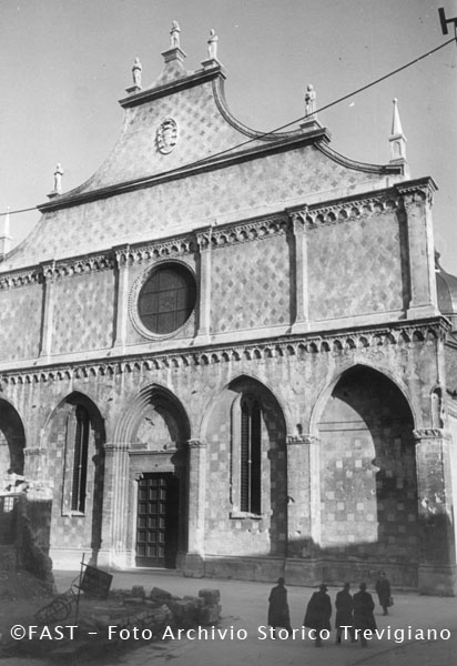 Vicenza, Cattedrale cittadina dedicata alla Vergine Annunziata, veduta della facciata. L'immagine documenta lo stato del duomo dopo i lavori di restauro inziati, in seguito ai bombardamenti sull'edificio del 1944 e il 1945, a partire dal 1946. In occasione di questi lavori il prospetto venne ricondotto alle proprie forme originarie, scandito su quattro livelli, così com'era prima del crollo dello stesso nel 1581. Le operazioni di ripristino furono dirette dal Soprintendente ai Monumenti Medievali e Moderni del Veneto Orientale arch. Ferdinando Forlati. Al centro del nuovo fastigio venne collocato lo stemma del Vescovo Zinato, sotto il quale episcopato si procedette all'erezione delle parti bombardate del tempio.