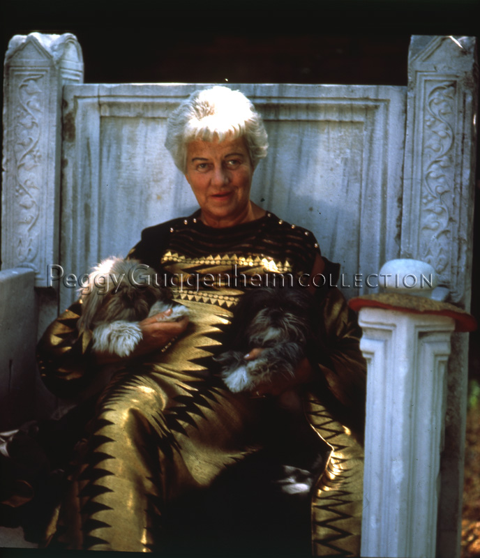 Peggy Guggenheim seduta sul trono bizantino con due dei suoi cani, nel giardino di Palazzo Venier dei Leoni. Peggy indossa un abito creato da Kenneth Scott nel 1966.