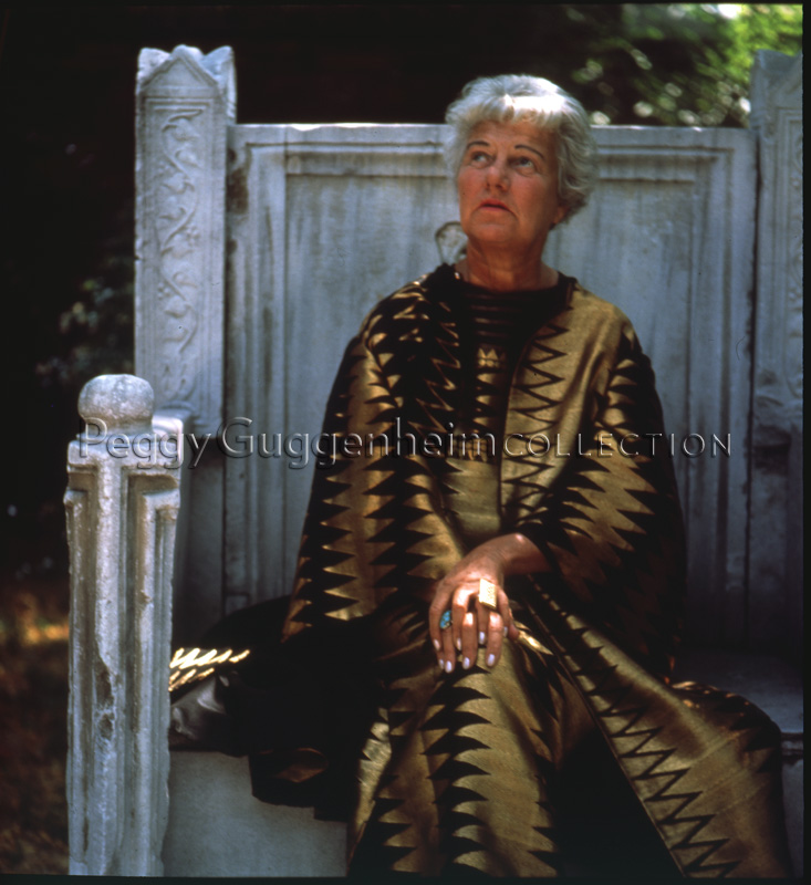 Peggy Guggenheim seduta sul trono bizantino, nel giardino di Palazzo Venier dei Leoni. Peggy indossa un abito creato da Kenneth Scott nel 1966.